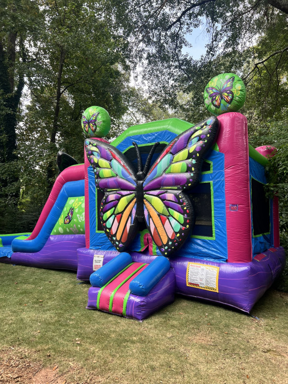 Introducing the NEW Butterfly Dual Lane Combo! This unique and colorful dual lane bounce and slide combo will be the hit of any party, school, church or corporate event! Its large bounce area, interior basketball hoop and dual lane slides will provide hours of fun for all!