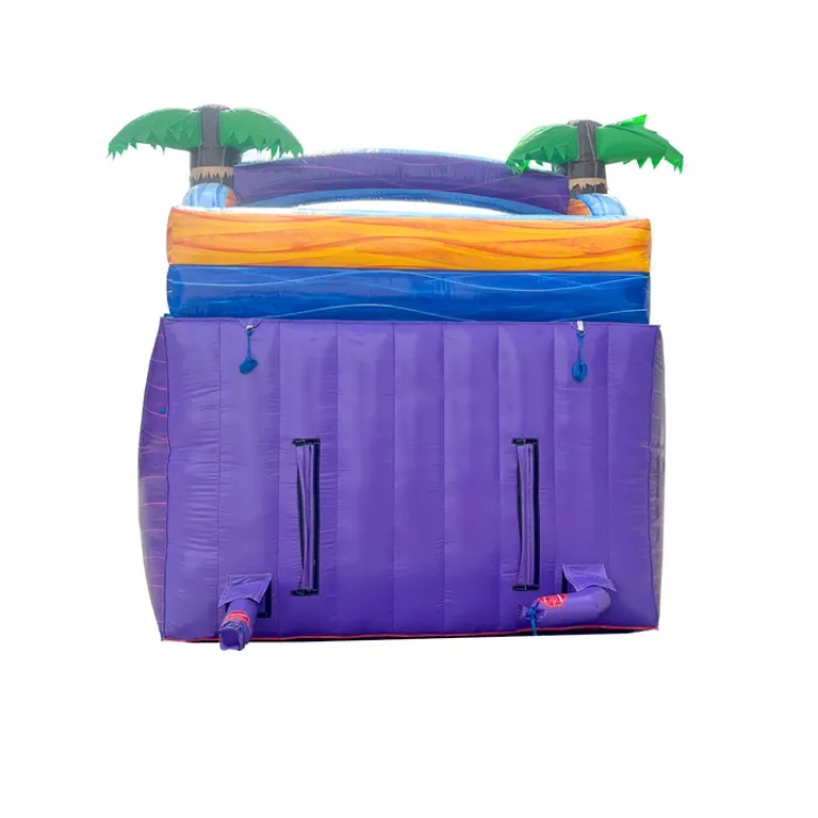 The stunning purple marble vinyl and tropical palm tree accents make this slide a standout centerpiece at any event. With two racing lanes, kids can race side-by-side, keeping everyone entertained and moving quickly through the line. Even without water, this dry slide delivers smooth, thrilling speed that kids love.