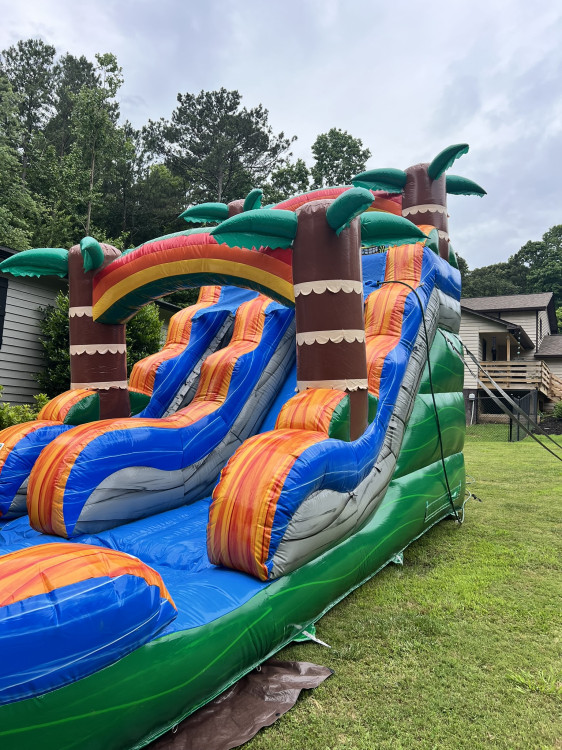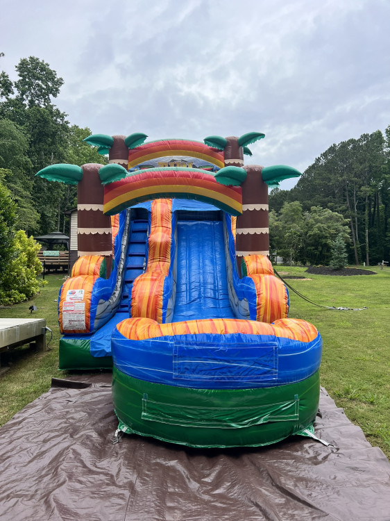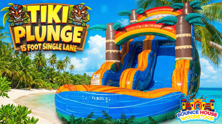 15' Tiki Plunge water slide is going to be one of the most popular inflatable water slide rentals this summer. Reserve it early so your guest aren't left out in the sweltering heat this summer! The new tropical tiki color scheme is sure to impress your guests when they arrive. The 15' Tiki Plunge water slide is sure to be a hit for the young and old at your party. As they climb to the top and get ready for a cool refreshing thrill as they slide down the 15' slippery slope into a large, inflated splash pool at the bottom. If you are searching for a good way to beat the heat this summer then it's a no brainer for what you need to entertain your guests, a WATER SLIDE RENTAL!